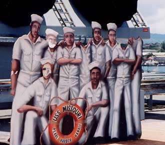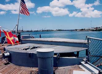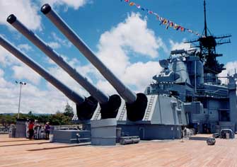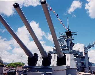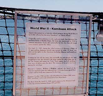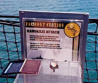 1945年4月11日 空母イントレピッド等と58.4任務群を構成していたミズーリは沖縄近辺で特攻機の攻撃を受け、爆装した零戦が突如右舷後方から接近、 第三主砲塔右舷側、最上甲板より1m下に突入しました。しかし、爆弾は炸裂せず、四散した機体がパイロットの遺体と共に上甲板を転がり、残存ガソリンによる 火災が発生した程度の損害しかミズーリは受けませんでした。勿論犠牲者も居ません。しかし、この突入シーンは激突寸前にカメラに撮られ、ありとあらゆる神風 関係の書物に掲載されました。皆さんの中にも見たことがある人もいるでしょう。今、そこには突入箇所を示す掲示板とスタンプ台があります。よく見ると、舷側 ガンネル部が少し凹んでいるのが分かります。因みにこのスタンプ台は艦の内外構わず至る所にあります。場所によっては5mも離れていない所もあり、本気で押 していくと、ウンザリしてきます。ただし、日本のスタンプラリーの様に全部押せば景品が貰えるというのではありません。あくまでも自己満足のためですので。