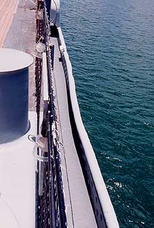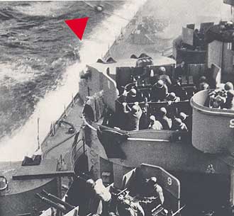昇降口を出て伸びでもしたら、第3主砲塔横の右舷側に行ってみましょう。ここは歴史上有名な箇所です。 | ||||||