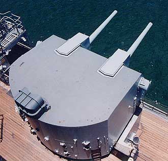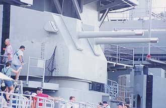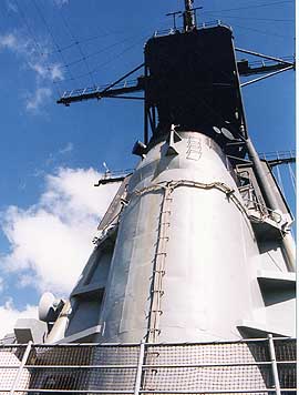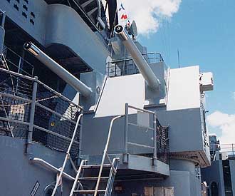 左舷側にある127mm両用砲は中が見られる様になっています。半自動装填の巨大な尾栓が目に付きます。当時世界各国の戦艦に採用されていた対空砲の中では、ずば抜けた性能ではあ