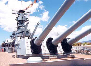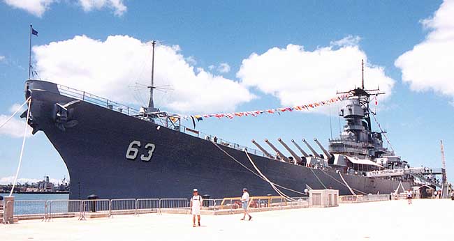 しかし、現実は厳しい。海に浮かべた鋼鉄の船を維持するのは本当に大変なことです。どの国も、後ろ髪を引かれる如く、 その巨体をスクラップ業者に売り渡すハメとなったのです。そう、一国を除いて。 アメリカは大国です。いえ今じゃ世界で唯一の超大国です。歴史上、全世界に覇権を示した国は古代ローマ帝国、大英帝国、 そしてこのアメリカ合衆国のみでしょう。この3つの強国に協調しているのは、当然ながら、世界最強の軍事力を有してい たことです。今、世界はパクス・アメリカ(アメリカによる平和)によって成り立っています。そう、平和は軍事力によっ て保たれるのです。軍事力に裏打ちされた国威によって、世界のリーダーとなれるのです。(平和は、女神が剣を付けて現 れる時にしか存在しない。−セオドア・ルーズベルト) そのアメリカはさすがというか、国威の象徴とされた戦艦をつい最近まで、保有していました。しかも現役バリバリで。又 国内に多くの記念艦として、戦艦を保有しています。今世界を見回しても戦艦を残せた国は一国もありません、アメリカの みなのです。アメリカは他にも多くの艦船を残しています。広大な国ならではのこともありましょうが、アメリカという国 が強大な軍事力によって支えられていることを忘れてはいけないでしょう。飛び抜けた経済力、世界の最先端を走る文化な どにカモフラージュされてはいますが、アメリカは超軍事大国なのです。その軍事力の象徴、アメリカを支える大黒柱の一 つとしての軍事力の象徴として戦艦を保有しているのです。彼らは絶対に過去のモノではありません、そして決してお飾り ではないのです。(船は女性と言うことになっています。本来なら三人称は「彼女」ですが、戦艦を女呼ばわりできない私 は「彼」と呼ぶようにしてます。) 今回、ここで紹介するアイオワ級戦艦「ミズーリ」はその様な船の一隻です。彼はオワフ島のパールハーバーに現在その偉 容を保ったまま静かに係留されています。ただ彼が余生を楽しむためにここにいるわけではありません。未だ、世界をリー ドするアメリカという国を背負って居るんだという自負の元にドカッと座っている..そのグレィの船体を見て私は思いま した。 現在アメリカには先に書いたように多くの戦艦が記念艦として残っています。彼の兄弟艦も逐次、お仲間入りするでしょう。 ただ、彼には他の戦艦とは決定的に違うところがあります。それは比較的にしろ、我々日本人が容易にその巨体を崇める所 にいると言うことです。ここを読まれている皆さんも将来一度ぐらいは何らかの形で、ハワイを訪れることがあると思いま す。波乗りもショッピングも良いですが、少ない日程の中で、何とか時間を作って彼を見に行ってください。 このページ はそう言う皆さんのために、彼の魅力を紹介する共に、何らかの参考になると思い、作ってみました。 |