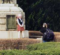 ●それにしても午前中の下り電車はのんびりしてるなぁ。お日柄も良く何だか眠気を誘う。航空公園駅で下車して、公園に向 かう。もう何処でも良いから適当に座ってお弁当を広げる我々一行。作りすぎた弁当に配慮して朝を食べてない我々はもう空 腹でフラフラだ。空腹は最上のソース、何でも美味しく食べられるぞ。 ●もり〜んも色々あったが、何とか合流に成功する。酒のせいもあって眠くなってきたので、ちょっと一眠り。花見らしいよな。 ●最近、仕事とはいえ、ずっと引きこもり中で鬱鬱状態だったもり〜んも大はしゃぎだ。やっぱりたまには息を抜かないとね。 ●売店に行く途中、何やら日本初の飛行機事故の犠牲者の記念碑を覗いていると後ろに異様な男が...何と、その男は、あ の1/1ティナを二体を持って立ち尽くしていたのだ。しかもその一つは例の60万円ボディの最新型..!わざわざ車椅子 に乗せてる〜!(この最新ボディは身体が曲がるのだ。)思わずその場を離れた我々を尻目に黙々とティナを記念碑前に立た して撮影を始めたのだった。何度も髪型を整えながらの作業、時折、通りかかる人や子供達が不審そうに見ているのだが、そ れには一瞥もせずに撮影を続けている。同じティナユーザーとして声を掛けようと思ったのだが、その何とも言えない「気」 に押されて、我々は何にも出来無かった。いやしかし、ティナを色んな所に持って行って写真を撮ってる人がいることは知っ てたし、そー言う写真も見たことはあるが、まさかそのロケ現場に出くわすとは..!しかもこんな混み合う花見の場の衆目 の中で...!う〜ん恐るべし..!