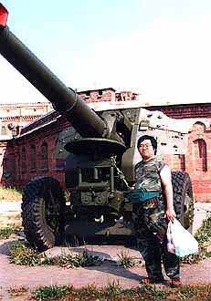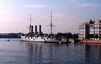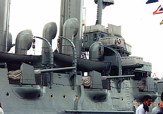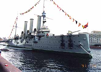 オーロラ号 崩壊しようが売店に何も売ってなかろうが、このホテルの最大の売りは、対岸にオーロラ号を見渡せることだろう。事実、彼女は原則に北 国の太陽を浴び、輝くようにして係留されていた。ホテルでの食事もそこそこに、我々は直ちに対岸に渡った。 「真鍋さん、僕が以前来た時に、ここらの露店で素晴らしく出来の良いオーロラ号の金属製の模型が売ってたんですよ。でも、アレはきっ と、手作りだからもう手に入らないかも知れませんね」 と言う言葉も終わらないうちに 「もしかしてこの事ですか?」 それは山積みになって売っていたのだ。何のことはない、量産品だった。 「そんな..てっきり手作りだと..あ!!安くなってる!!」 ドクトル、ダブルショックである。しかし今度は私がショックを受けることになる。オーロラ号に乗れないのだ。がーん!!どうしてどうし てとオタオタしていていると周りの雰囲気で何となく原因が分かった。時期が悪かったのだ。今回のロシア旅行は斎木氏の取材もあってロ シア海軍記念日に合わせての日程だった。それが裏目に出たのだ。この大事な海軍の祝典にオーロラ号が使われないはずがない。おそらく 艦上でも式典が執り行われるのだろう。そこを観光客に土足で踏みにじられるわけにはいかないのだ。そう言う理由での立入禁止なんだろ う。そう納得した我々はわずか10数メートル先に停泊している、整備の行き届いた美しい艦容に向かってひたすらシャッターを押すのみ であった。 | ||